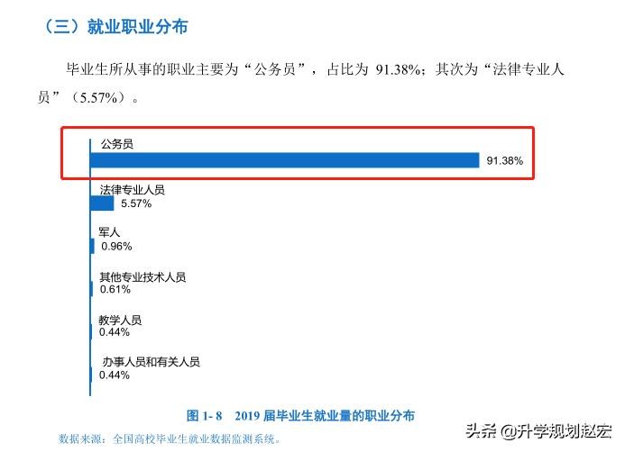 再来看看2019年就业职业分布,公务员占比91.38%,对比2020年,下降了10%;法律专业人才下降了3%;也可以看得出2020年的就业情况有点难,疫情影响也很大;