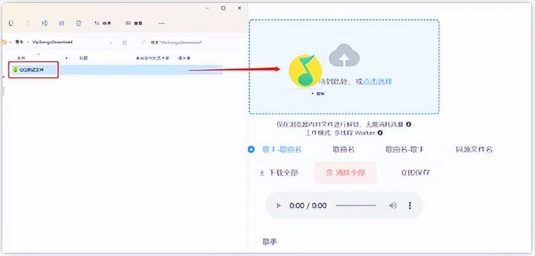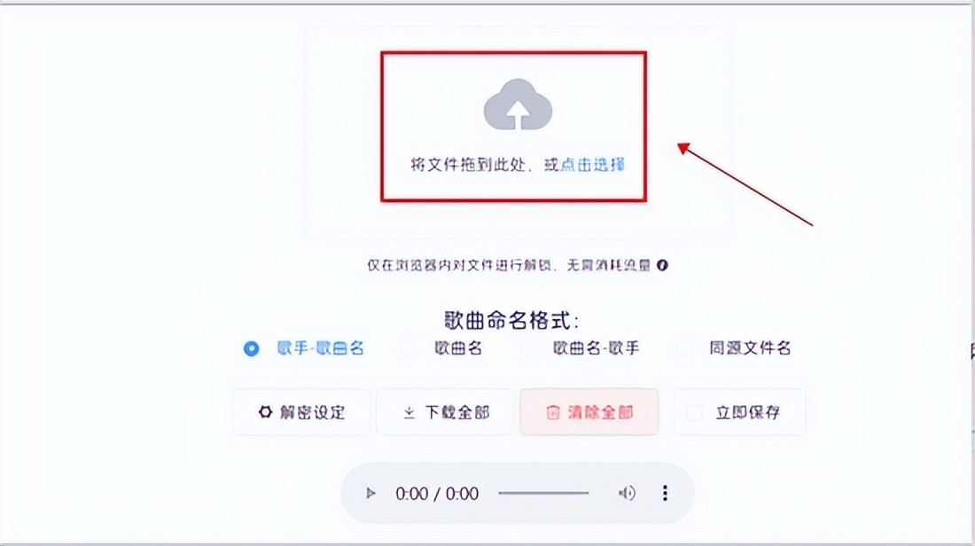1、打开音乐解锁的网站,进入到文件转换的页面。将需要转换的音频文件拖拽到网站的文件框中。