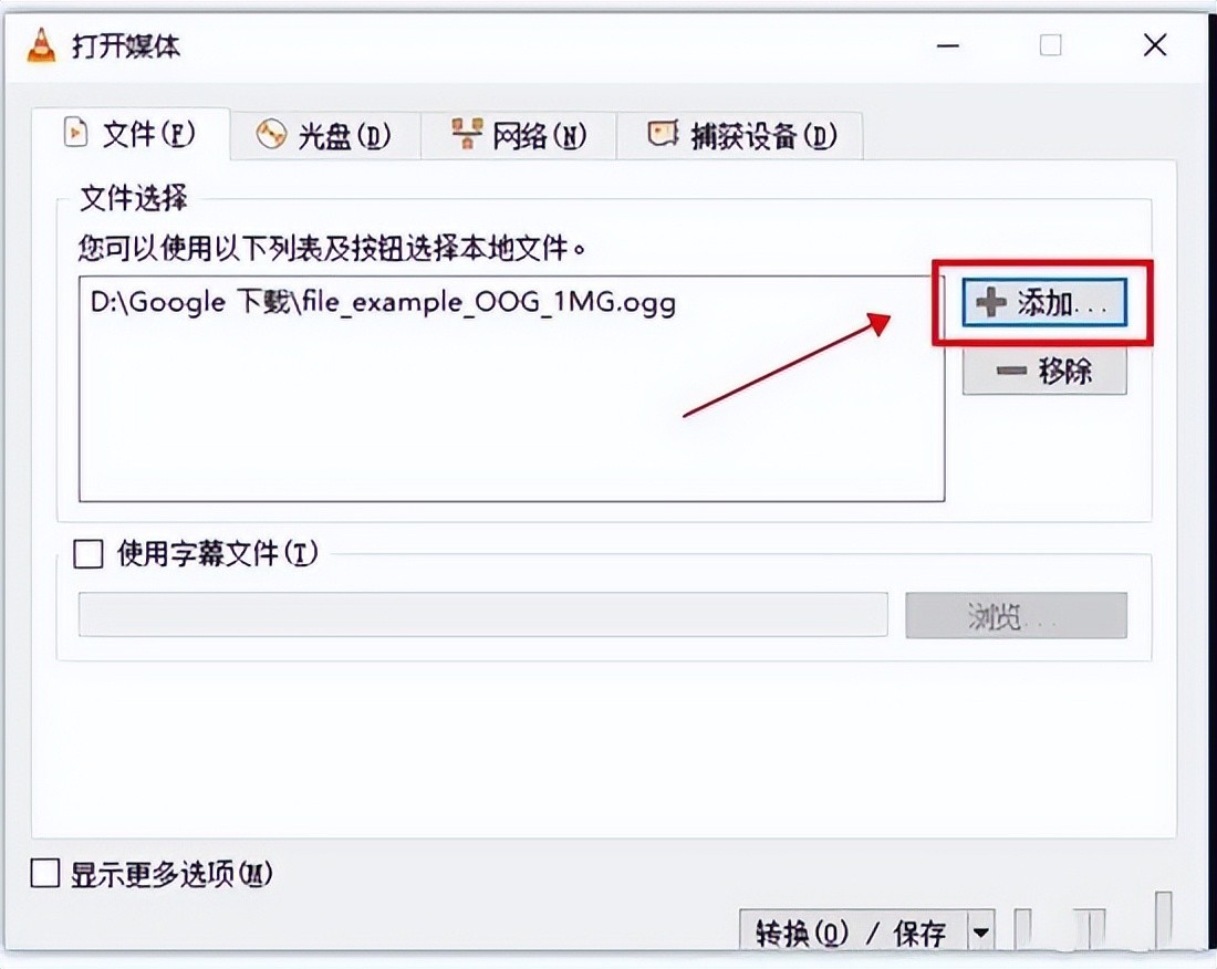 2、弹出添加文件界面后点击“添加”按钮将需要转换的文件添加,并且在右下角点击“转换/保存”按钮。