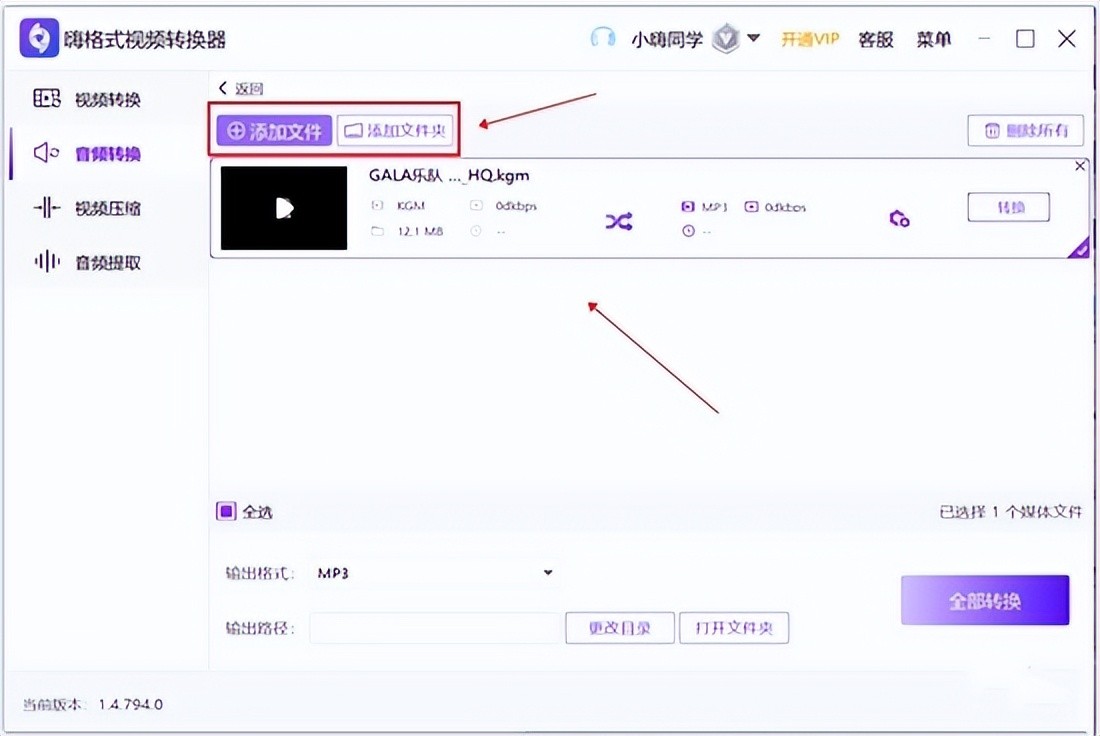 2、点击“添加文件”按钮,选择需要转换的KGM格式音频文件。你可以通过点击添加按钮或将文件直接拖放至界面上来完成文件的添加。