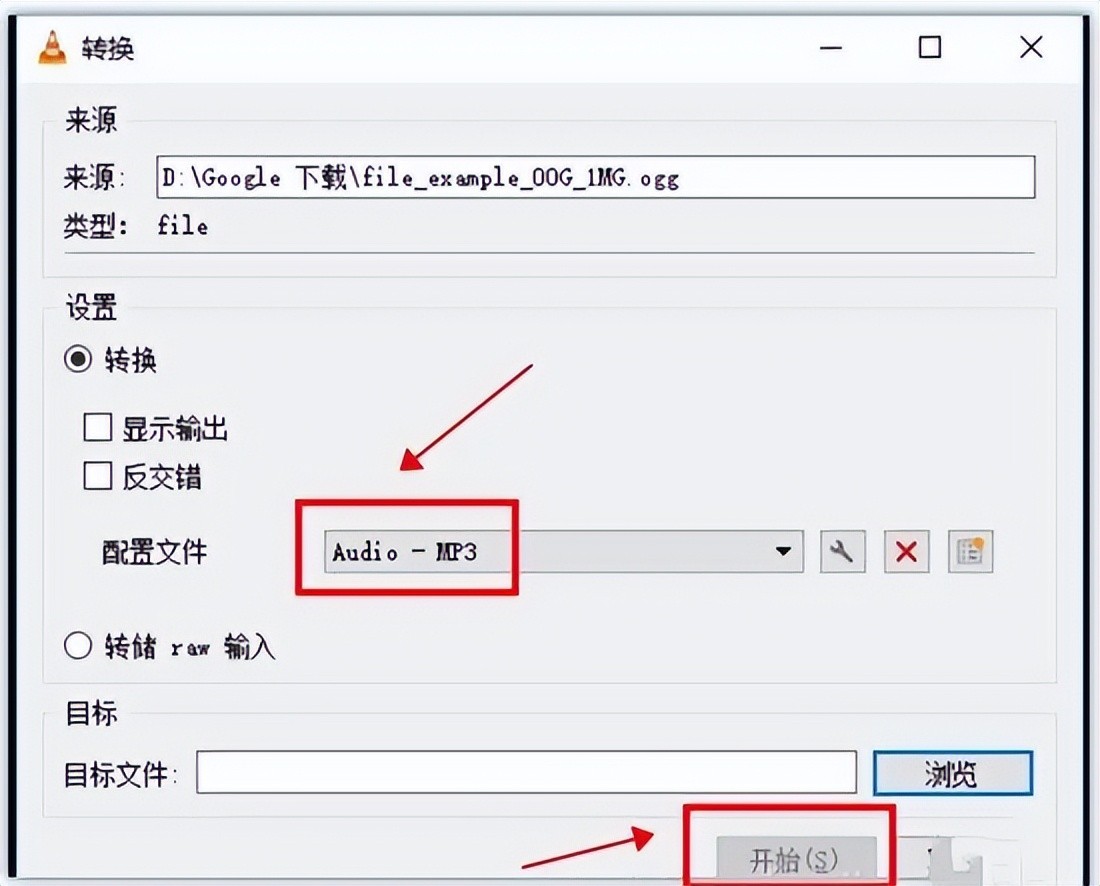 3、在“配置文件”选项中选择需要转换的音频格式,点击倒三角标识,选择“Audio-MP3”,最后点击“开始”按钮,即可进行文件转换。