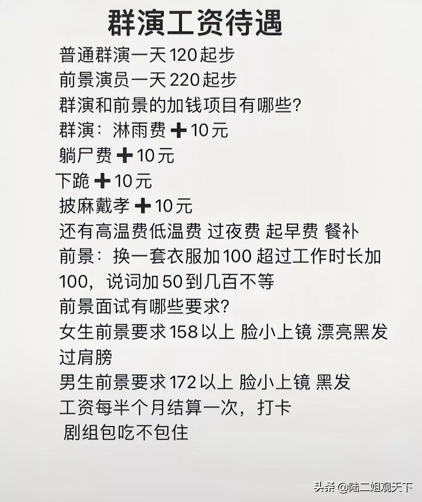 现在做服务员,流水线的普通工人,月收入也不止这么一点点啊。年轻人只要愿意学习,能吃苦耐劳,进入职场比做群演的收入不知道要高多少。