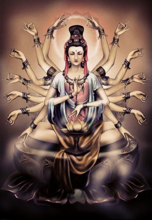 在佛教经典中,观音菩萨通常被描绘为一位具有千手和千眼的神灵,也被称为“千手千眼观音”或“普贤观音”。