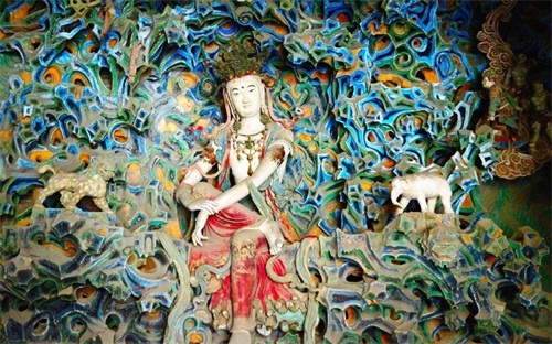 在隆兴寺的摩尼殿内,殿北侧有座五彩悬塑的假山,山上祥云缭绕,峰峦叠嶂,正中端坐着的塑像就是观音菩萨。