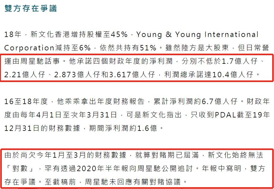 由于尚欠今年1月至3月的财务数据,就算对赌协议期满,购买方始终无法对数,最终透过半年报向周星驰公开讨债,年报中写明,双方存在争议。至截稿前,周星驰未回应有关对赌协议。