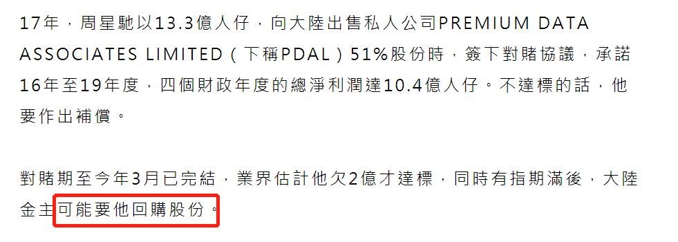 对赌协议在今年3月已经完结,业界估计星爷还欠2亿未达标,同时有指期满后,他可能要出资回购股份。
