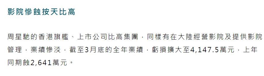 同时,周星驰经营的几家影院院线,这半年来受疫情影响业绩惨淡,截止今年3月底的全年业绩,亏损超4000万,上半年同样亏损2641万元。