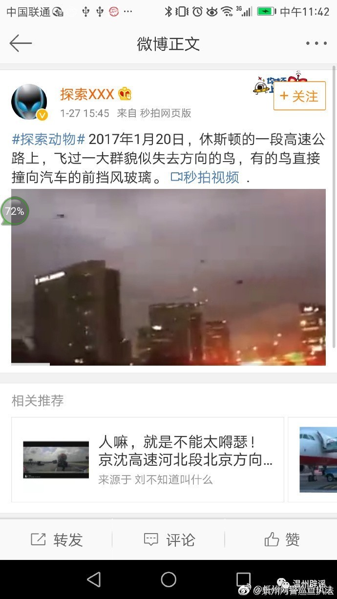 微信群传一段视频,一群鸟儿在公路上乱飞,并称是成都地震前的异象。