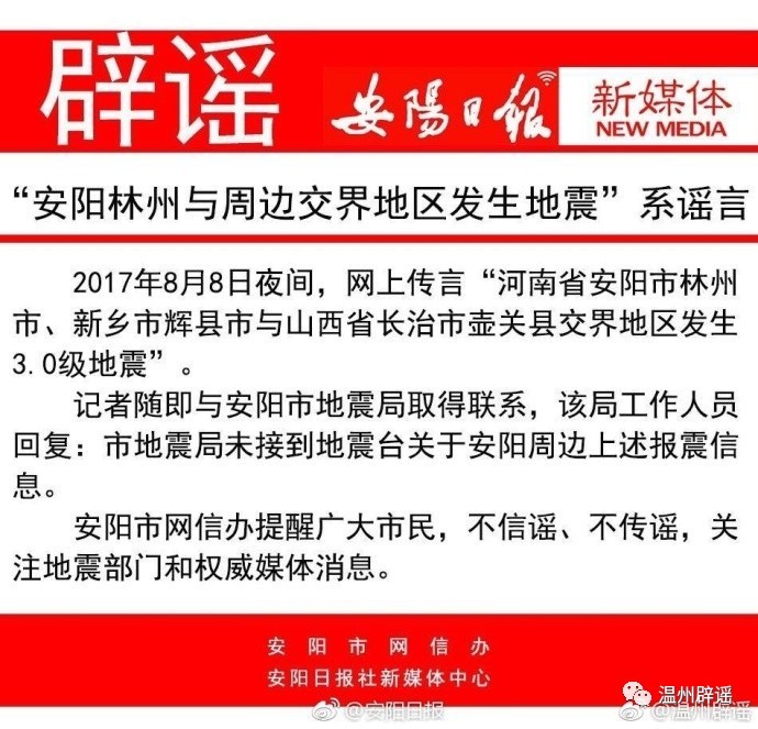 同时,微博里还流传着关于其它地区发生地震的谣言!2017年8月8日夜间,网上传言“河南省安阳市林州市、新乡市辉县市与山西省长治市壶关县交界地区发生3.0级地震”。