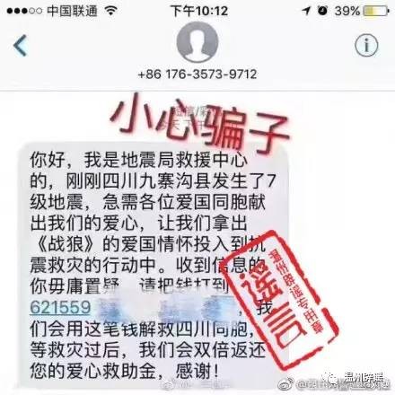 目前已发现有不法分子蒙蔽良心,欲借地震灾情骗取老百姓的钱财。提醒:不要轻信来源不明的信息,尤其是涉及财物方面的信息,一定要仔细甄别,防止上当受骗!