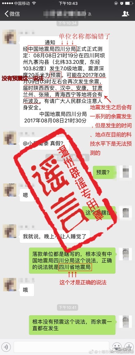 这个谣言可谓槽点满满:一、相关单位的名称都写错了,正确名称应该是四川省地震局而不是中国地震局四川分局。二、不存在预震一说,地震发生后会引发一系列的余震。三、地震以及随后的余震发生的时间、地点在目前的科技水平下都是不可预测的。