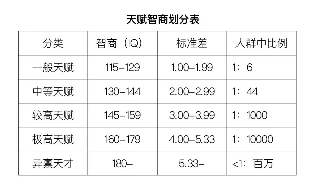 在标准化智力测验中,人的智商(IQ)基本上服从正态分布,高于130者大约占人群的2%左右,可称为天才吧。对高智商或天才迄今没有共识性定义,美国高校热衷将IQ高于130的青少年视为天才,积极吸收入学。许多智力研究者喜欢用以下级别划分天才儿童智商。