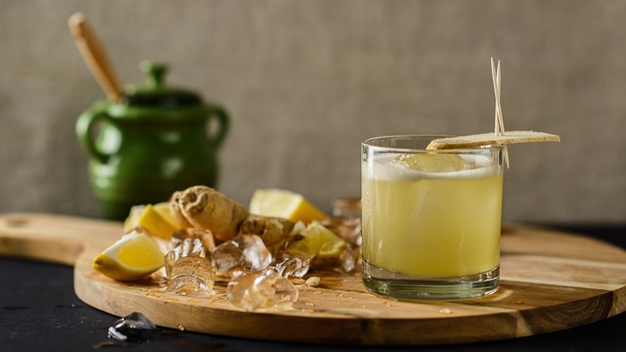 调和威士忌60ml新鲜柠檬汁22.5ml蜂蜜&姜糖浆 22.5ml泥煤威士忌7.5ml