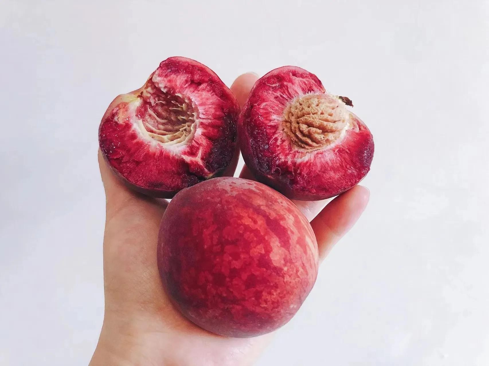 也叫紫胭桃,是甘肃省稀有的桃品种。因颜色紫红中含绿,呈胭脂色而得名,被誉为“戈壁桃后”。果肉呈蜜白色、味甘清香、含汁丰富,果肉与果核可轻松分离。