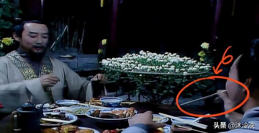但令人意想不到的是,等到镜头切换到贾雨村正面吃螃蟹的画面时,离谱的一幕发生了,他手里的金签竟然变成了一双一次性筷子。