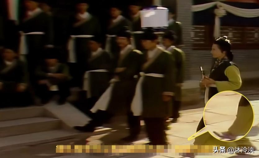 等到众人在府门口仔细干活时,旺儿媳妇也来到了此处,她奉王熙凤的命令准备用对牌取纸扎,可就在旺儿媳妇即将走动台阶处,我们仔细一看的话,你会发现她脚上竟然穿着一双现代款式的凉鞋,这个穿帮镜头多多少少有些敷衍了啊。