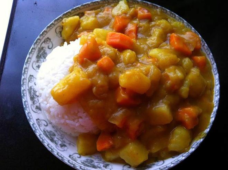 土豆1个、胡萝卜1根、洋葱0.5个、咖喱块2块、米饭1碗