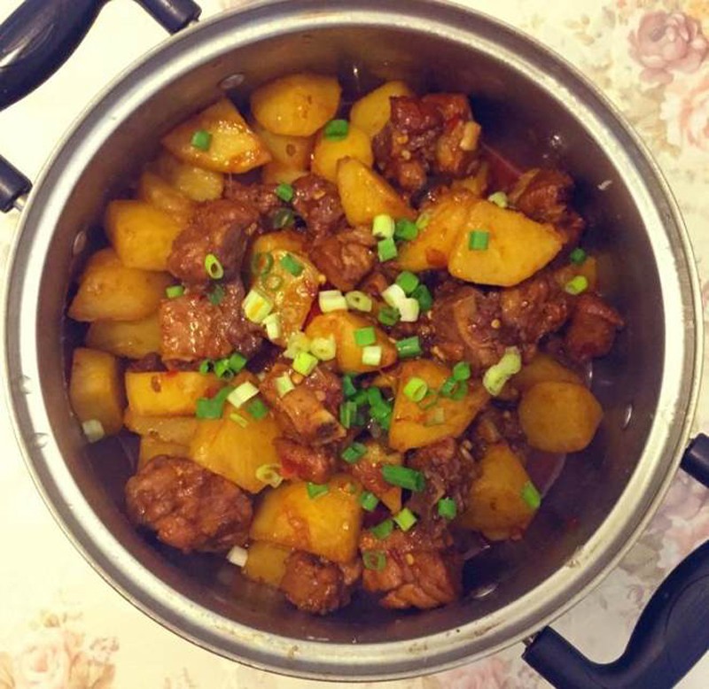 土豆3个、猪排500g、干辣椒若干、大葱段若干、豆瓣两勺、酱油少许、料酒少许、大料若干、花椒少许、姜片少许、白糖一勺、盐少许、蚝油少许