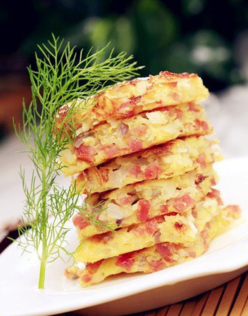 土豆切丝(或者有擦丝的工具将土豆擦成丝),洋葱切小粒,香肠切小粒、打两个鸡蛋。将鸡蛋土豆丝广东香肠搅拌均匀、加入盐、胡椒粉、料酒调味。不粘锅内放入油,油热将土豆鸡蛋液倒入锅中。单面煎至变硬,翻面继续煎、直至两面金黄盛出切成小方块即可。