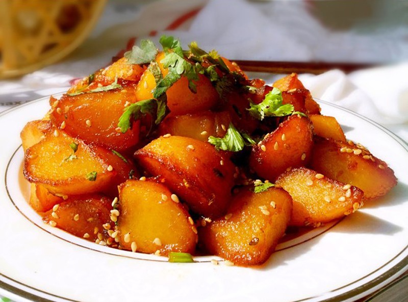 土豆去皮切滚刀块,香菜洗净,一勺料酒,两勺生抽,三少白糖,四勺白醋混合均匀,锅中加适量油,开中火,加入土豆中小火慢煎,中间翻动一下,尽量每个面都煎到,煎至表面微黄,差不多八分熟,加入混合均匀的调料汁,加入半碗清水,我一般加开水,烧开后盖锅盖闷两三分钟,然后大火收汁,关火,撒上芝麻和香菜,装盘。