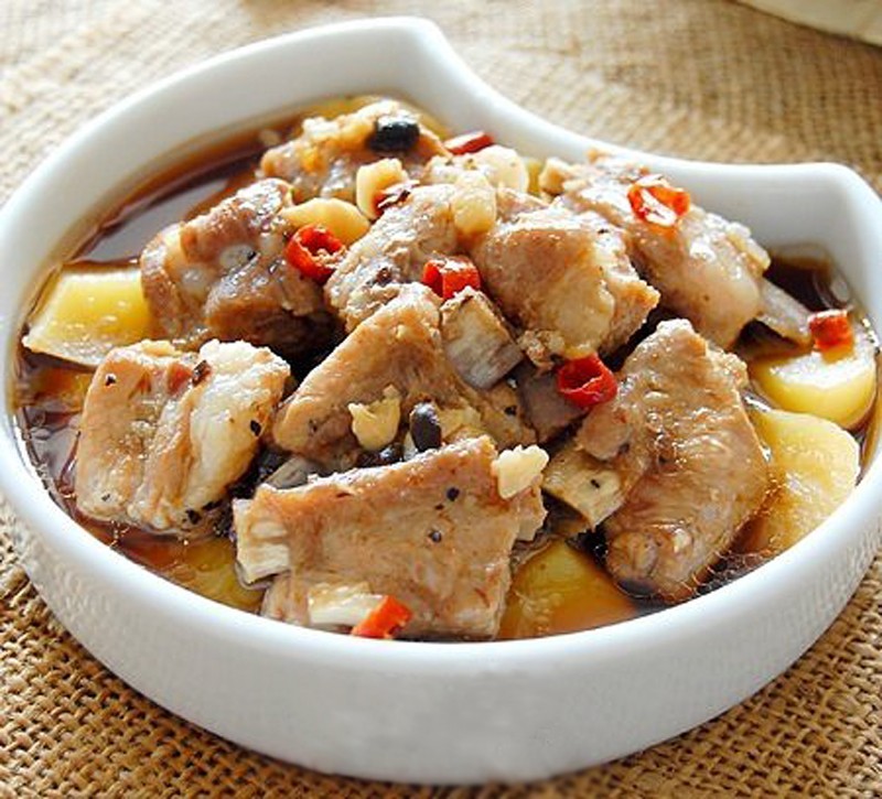 豆豉用冷水泡个3、5分钟,葱、姜、蒜、红尖椒切碎,与所有腌料(料酒、酱油、蚝油、盐、糖、胡椒粉、淀粉)混合拌匀。猪小排用清水彻底洗去血水,沥干水分,把排骨放入腌料中腌制大约1小时左右入味。土豆削皮切成小块,铺放在盘子底部。腌好的排骨放在土豆上面,上蒸锅中火蒸30分-40分钟即可(喜欢软一点口感的适当延长蒸煮时间)。