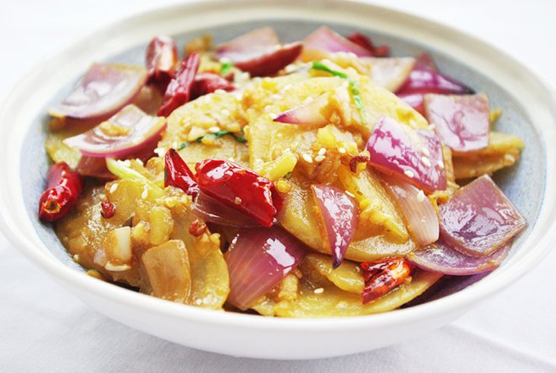把土豆切成2mm左右的薄片,先用清水泡5分钟左右,淀粉才会出来,不然炒出来的土豆很溶,是一坨。洋葱切成小块。切洋葱的时候先对半切开,然后每一半均匀的分成3份,再从中间切开,就会变成这样啦。热油,油要是平时炒菜的2倍,不然土豆会粘锅。把土豆炒至变色,起锅放至一旁。热油,放入洋葱翻炒至微香。接着倒入准备好的调料。调料:干辣椒对半断开,花椒,姜蒜切成小颗粒,葱切成长段。入锅以后翻炒一会儿,直到姜蒜的香气冒出来。然后加入炒好的土豆和生抽炒一会儿,再放盐、孜然和鸡精,就可以出锅了。
