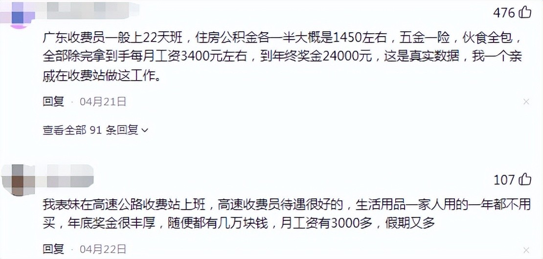 我徒弟的妹妹就是京沈高速的收费员。月薪3400元。逢年过节粮米蛋油购物卡。年终奖金10万一12万。
