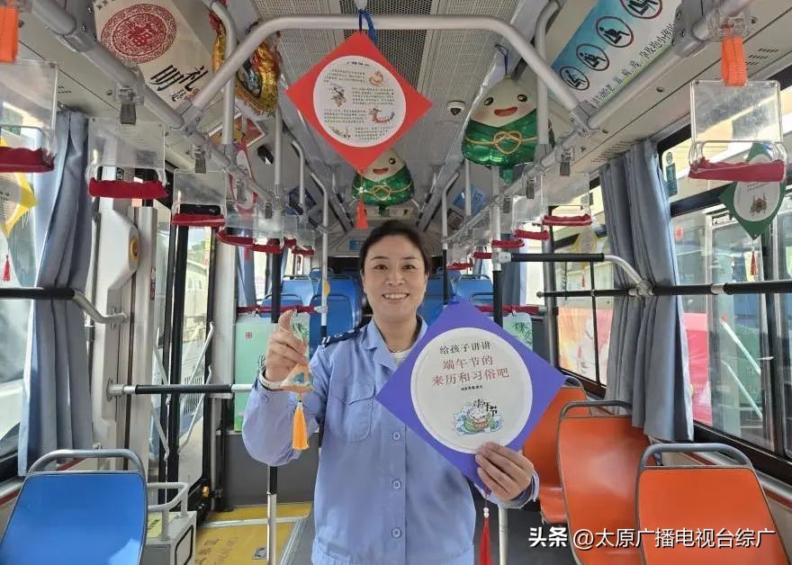 走进812路车厢,十余个憨态可掬的"粽子气球"格外引人注目——翠绿的粽叶包裹着饱满的"糯米",用金色丝带精心扎起,在车厢内轻轻摇曳。每个窗户上都粘贴着路长亲手制作的端午知识小卡片,图文并茂地介绍了诸如"端午为什么要吃粽子?""挂艾草的由来是什么?"等生动有趣的小知识。车厢里点缀的艾草香囊散发着淡淡香气,为车厢增添了浓郁的节日氛围。
