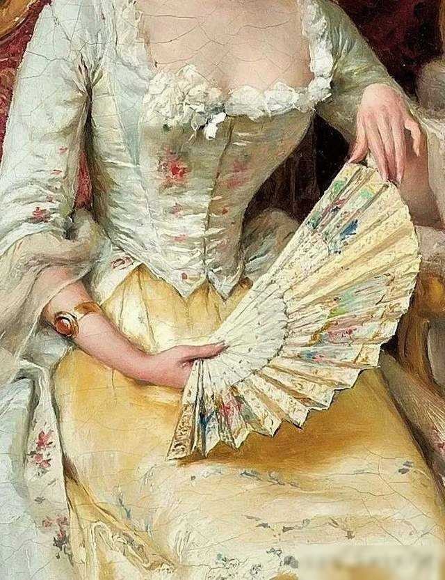 随着时间的推移,上流社会的贵妇们几乎走到哪里都携带一把宫廷扇。喜欢拿扇子的原因肯定不仅仅是为了扇风。猜测是为了让手有个地方放置,拿着扇子的开合动作也能展现手部的饰品。对于脸部有瑕疵或害羞的女士而言,使用扇子还能营造出犹抱琵琶半遮面的朦胧美。