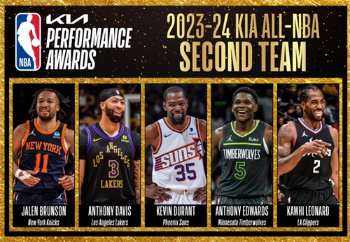 最佳二阵的球员包括安东尼·戴维斯、凯文·杜兰特、卡瓦伊·莱昂纳德、安东尼·爱德华兹和贾伦·布伦森。安东尼·戴维斯本赛季常规赛出战76场,创下生涯新高,场均贡献24.7分、12.6个篮板和3.5次助攻,帮助湖人取得47胜35负的战绩。虽然湖人在季后赛首轮被掘金淘汰,但戴维斯的表现依然值得称道。