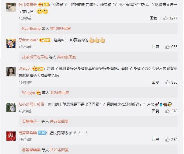 在评论中就有网友表示IG官博也别道歉了,天天在这糊弄谁呢?每次说改却没有一次是拿出行动去改的,也不用去给粉丝一个交代,只要去给Rookie一个好的交代就可以。也有网友表示:说过的要好好反省,每次好好反省就是这样的结果吗?更有网友表示,希望IG可以早点把Rookie给卖掉。
