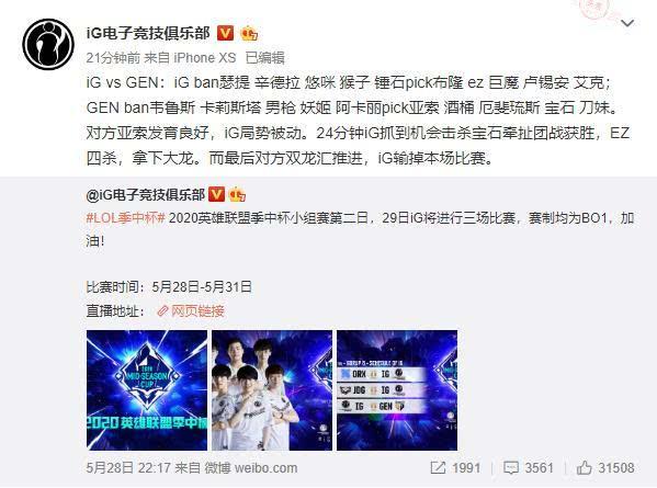 2025年中韩季中赛已经进行了第二天的比赛,这一天的比赛也是B组小组赛,争夺晋级半决赛的机会。在B组中大家最关注的肯定就是JDG和IG这两支LPL战队,但是在已经结束的比赛中,IG已经彻底被淘汰出局。IG也打出了本场比赛的最差成绩,小组赛打成0-3,一局没赢。对于IG这样的发挥,相信大多数人都没有意想到,在赛后很多网友都来到了IG的官博下进行评论。