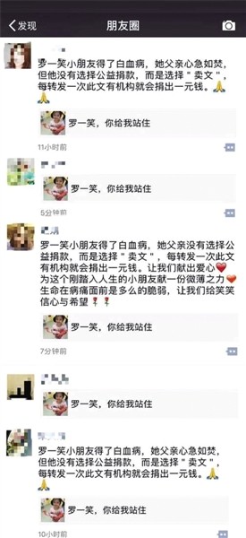 北京青年报11月30日报道,近日,一篇名为《罗一笑,你给我站住》的文章刷爆朋友圈。文章作者罗尔称,由于女儿身患白血病,他和一家公司商定,自己写的文章转发一次,公司就会为罗一笑捐赠1元钱。连日来这篇文章被众多网友“疯狂”转发。