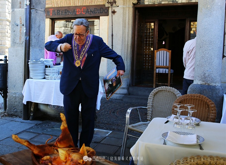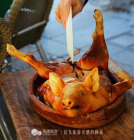 塞戈维亚的亮点就是罗马大渡槽(有人看成了大吐槽),和白雪公主城堡的原型-阿尔卡萨尔城堡。还有就是西班牙落成最晚的哥特式教堂,其他就是若干有的没的博物馆,不看也罢。此外,烤乳猪是这里的特色菜,几乎所有饭店都有。推荐大渡槽旁边的一家老店,我们还敢上了切乳猪的仪式,挂满勋章的老店主发表了一通讲演,然后用碟子迅速将乳猪切开,证明乳猪很酥嫩,接着很潇洒地把碟子往空中一抛,华丽丽摔个粉碎。全场一片掌声,而我却在想这一天得摔碎多少个盘子。。。