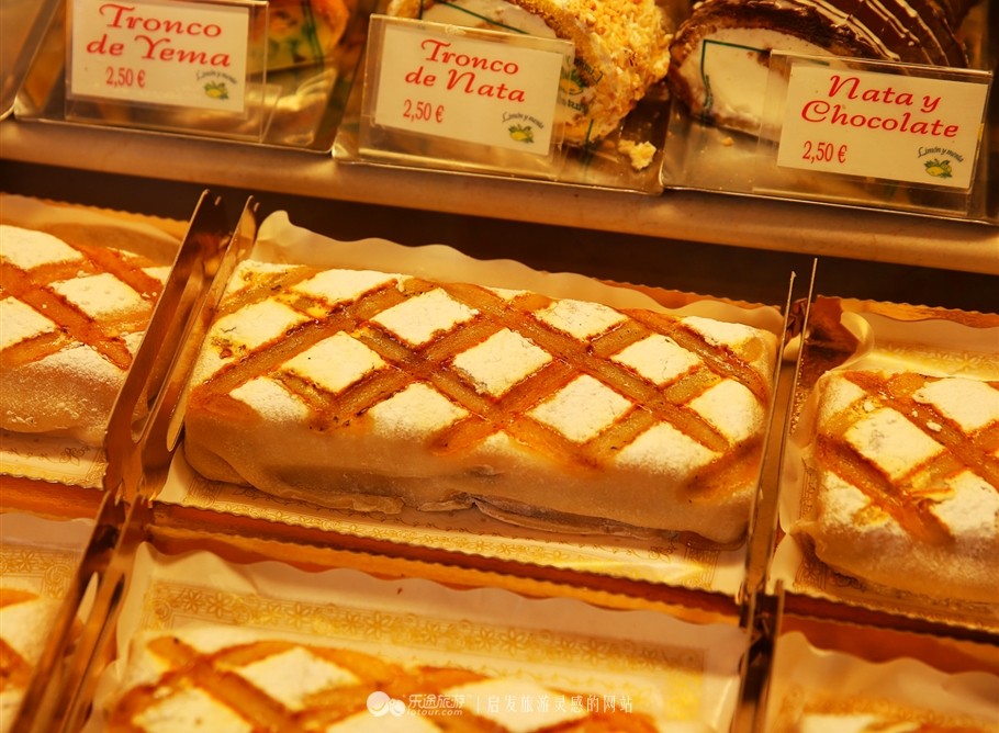法式糕点店Limon y Menta,我要在这里找寻一种柠檬口味的塞哥维亚蛋糕(ponche segoviano),其实店铺的LOGO就是一个显而易见的柠檬。蛋糕上面有杏仁蛋白软糖,并用糖霜点缀着十字交叉的图案。小块3欧,下面这种一长条的12欧。