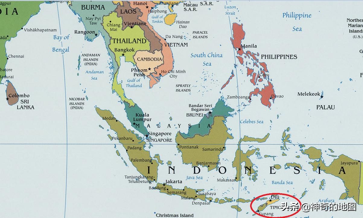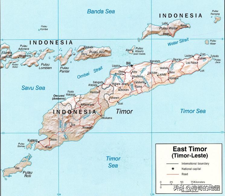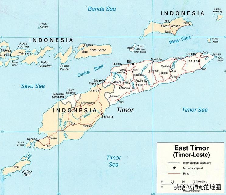 帝汶岛(Timor)面积不大,但上面却分了两个国家,一个是独立小国东帝汶(East Timor),国土包括岛的东半部及西部的欧库西(Oe-Cusse)地区,面积14874平方千米,跟北京市差不多,人口138万,相当于中国东部一个人口大县,首都位于帝力(Dili)。剩余面积面积15850平方千米属于世界最大岛国--印度尼西亚。为什么会这样呢,这要从西方殖民史说起。