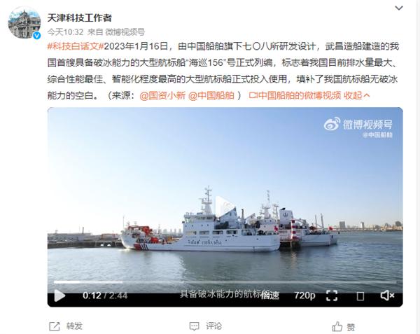 快科技 1 月 16 日消息,据 @天津科技工作者微博消息,今日,我国首艘具备破冰能力的大型航标船 " 海巡 156 号 " 正式列编。