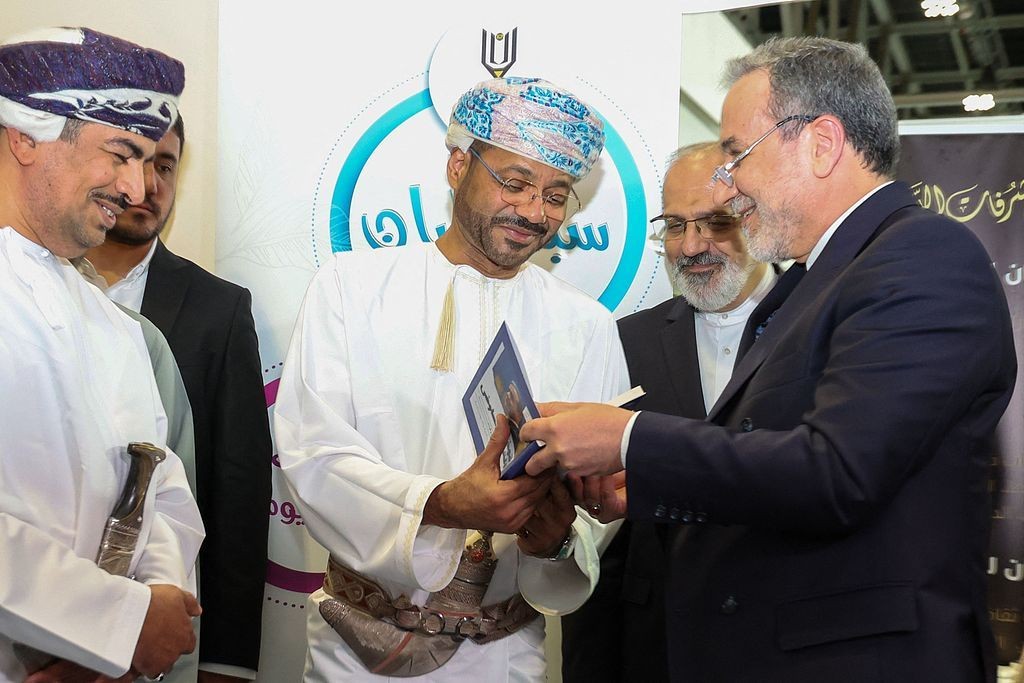 △当地时间2025年4月25日,伊朗外长阿拉格齐(右)在马斯喀特国际书展上向阿曼外交大臣巴德尔(中)赠书。(图自视觉中国)