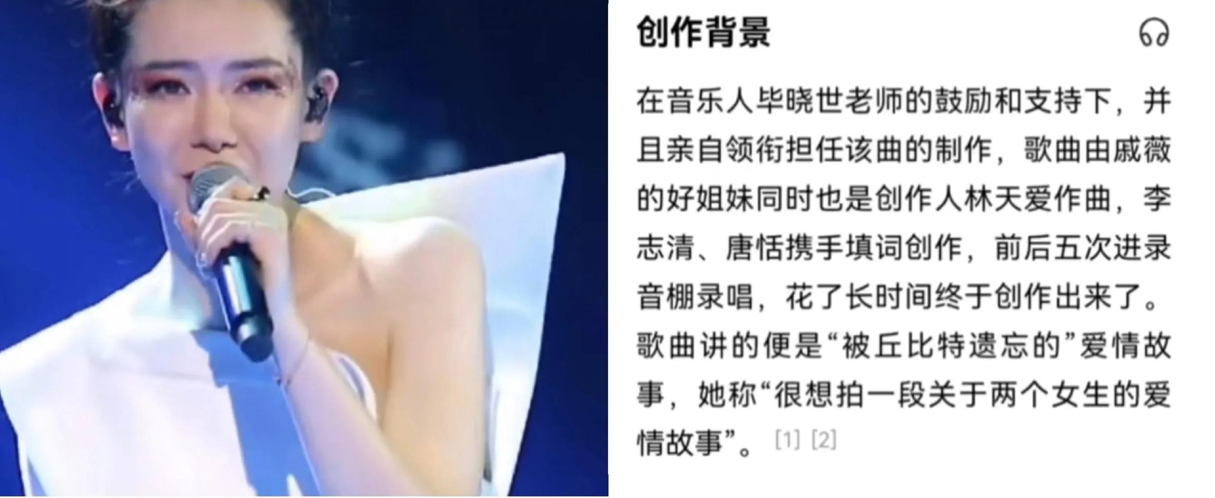 而大众怎么也不敢相信,站在戚薇旁边的短发似小伙子的林子君竟然是个女生。但是戚薇似乎接受了,在林子君多次的“尝试”后,戚薇不惜花重金为林子君买下歌曲《如果爱忘了》的版权并献唱给林子君,也算是一种双向奔赴。