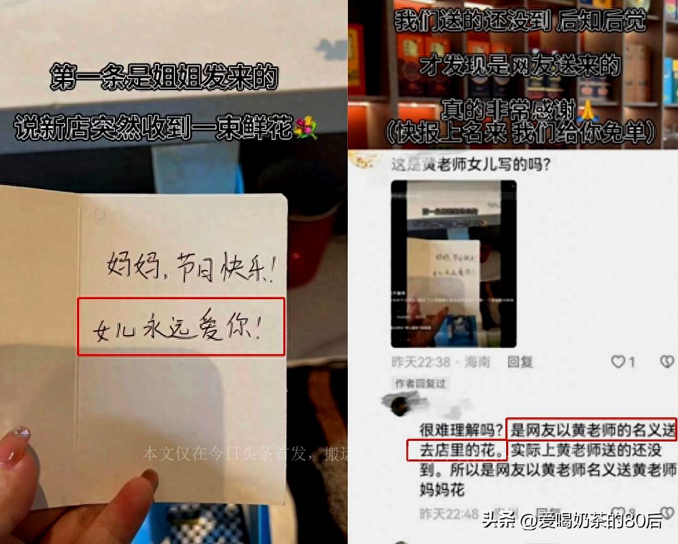 在母亲节这个特别的5月14日,黄老师晒出了新店铺收到的一束鲜花,花束上写着“妈妈节日快乐,女儿永远爱你”。网友以黄老师的身份送上这束花和母亲节贺卡,差点让大家误以为黄老师是个幸福的母亲。