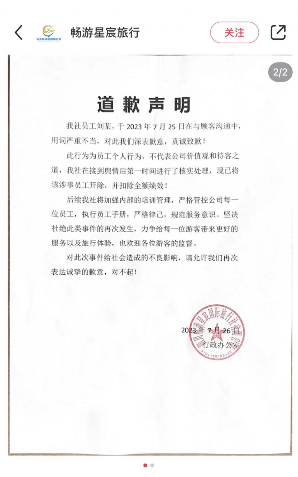 该旅行社就此事发布道歉声明称