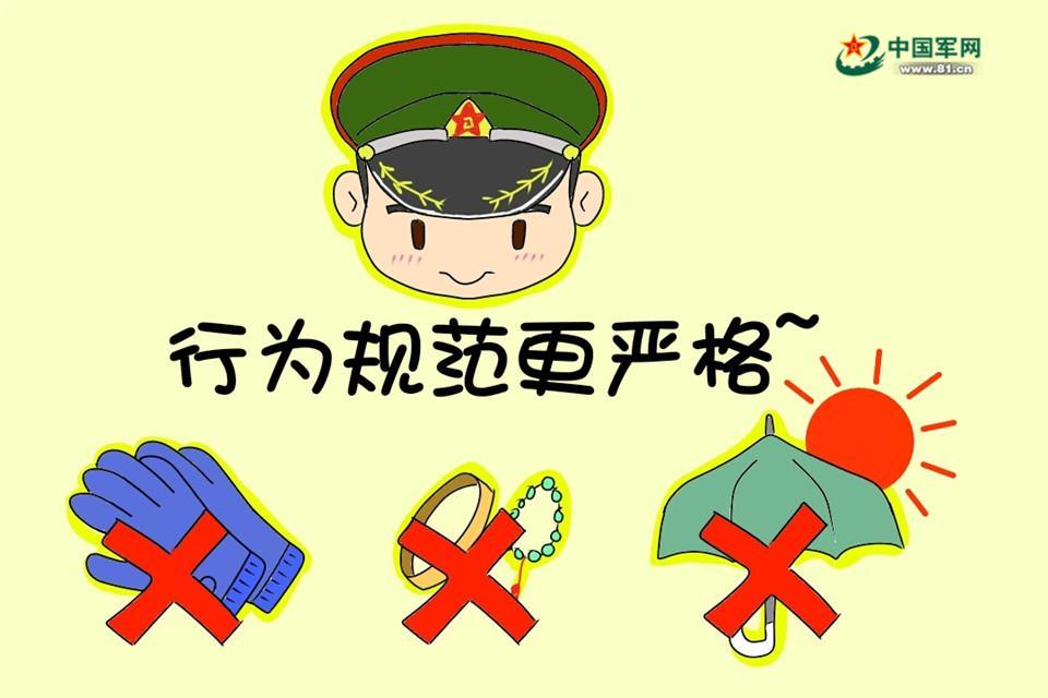 4.新条令从严规范了军人行为举止。明确军人着军服不得戴非制式手套、不得戴手镯(链、串),以及不得在非雨雪天打伞等规定。