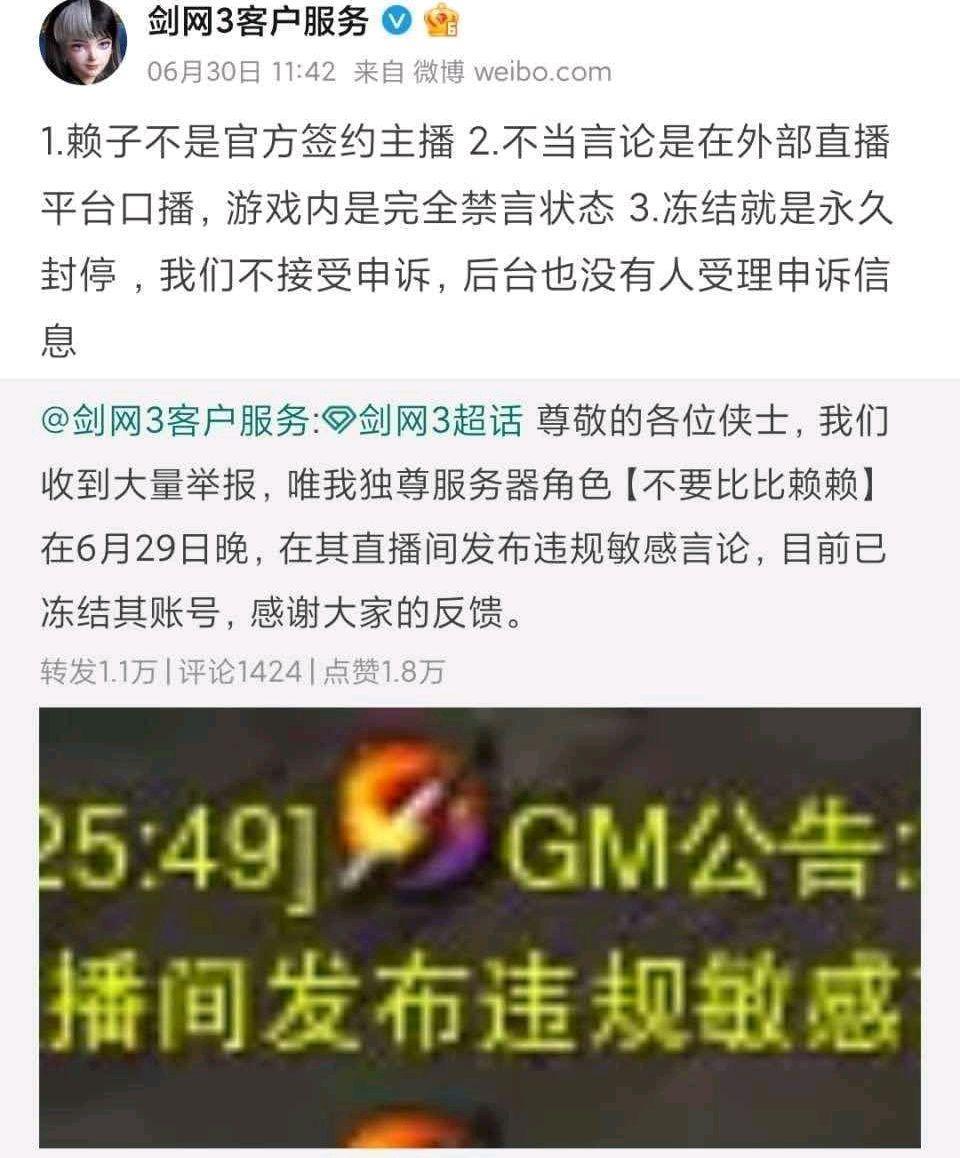 此事一出,剑网3迅速动作,迅速封停了赖子的游戏账号。