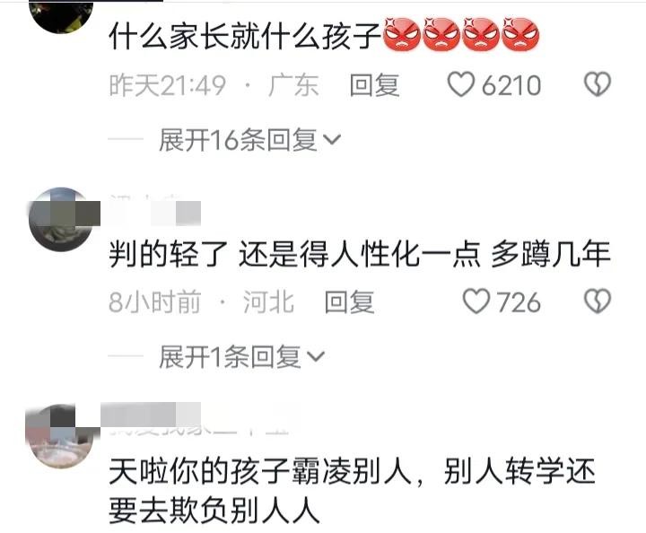 孩子被你们欺负的都上不了学了,患上了抑郁症。转学了,你们家长不但不知悔改,还在欺负,真是有什么样的家长就有什么样的孩子。继续加刑,无药可救!