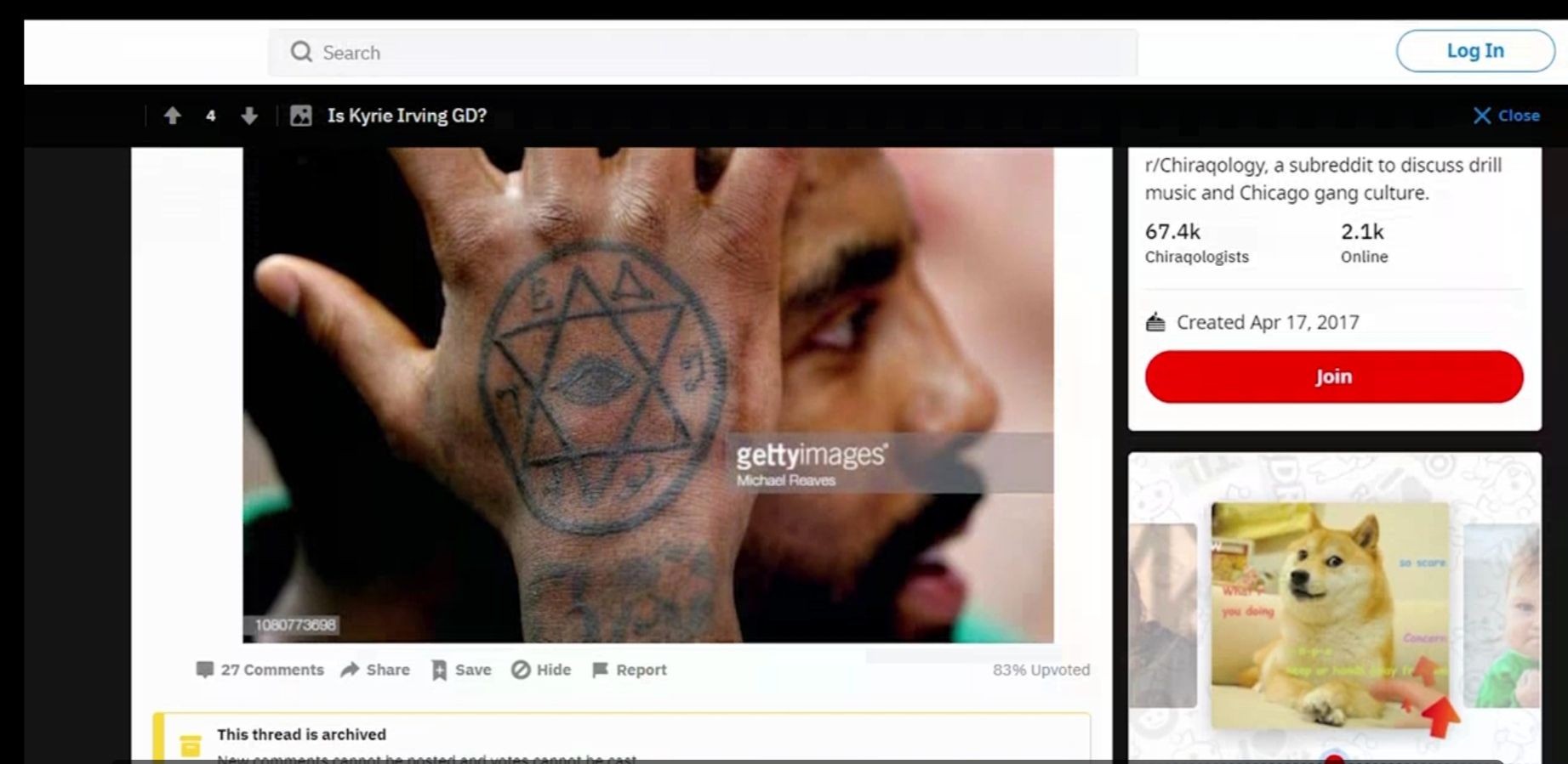 凯里欧文有一些不寻常的纹身,他右手纹身照片,引来网友热议,点燃了阴谋论的热潮,很多人把这个解释为撒旦的意思,也有人说是所罗门,甚至有人说是光明会的名片。