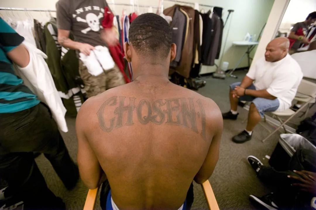 勒布朗詹姆斯当你是联盟最好的球员之一时,你会被看的很重,勒布朗的纹身被全世界球迷看到和关注。詹姆斯有24个纹身,包括他的家乡,他的母亲名字等,詹姆斯的背后纹有CHOSEN·1的字样,这个纹身是他的第一个纹身,寓意是就是天选之子