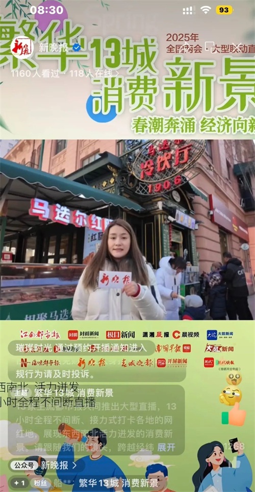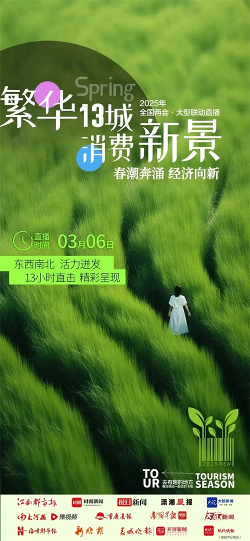 这是2025年全国两会大型融媒体策划《消费新场景 打卡“春天里”》重头戏。新晚报联合江南都市报、封面新闻、极目新闻、潇湘晨报、大皖新闻、大河报豫视频、重庆晨报&上游新闻、南国早报、华商报大风新闻、海峡都市报、春城晚报、现代快报,13家强势主流媒体重点聚焦一批文旅消费新场景,联袂呈现亿级大流量,掀起了“大力提振消费”的舆论大合唱。