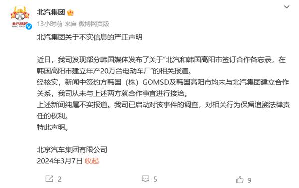 北汽集团回应韩国建厂:消息不实 将对谣言进行调查