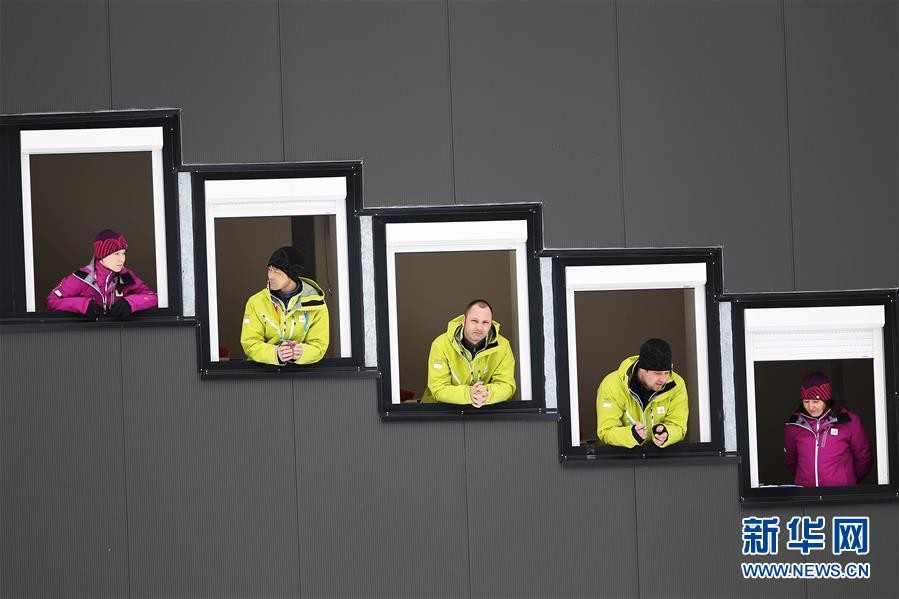 ↑图为2012年1月14日,五名工作人员在比赛场地旁的塔楼上,通过窗口观看2012青年冬奥会女子跳台滑雪比赛。 新华社记者李明摄