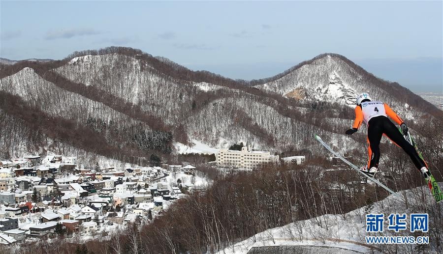 ↑图为2017年2月22日,中国选手孙建平在日本札幌举行的第八届亚冬会跳台滑雪男子个人标准台资格赛中。 新华社记者廖宇杰摄